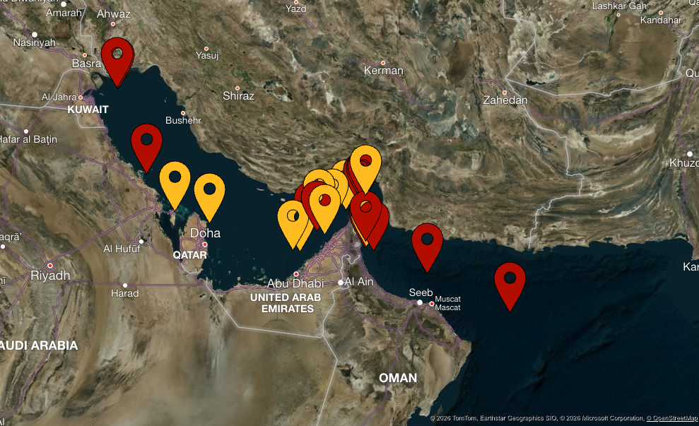 Figure 3: Locations of confirmed attacks (in red) and incident reports (yellow) since February 28, 2026, in and around the Strait of Hormuz (Source: UKMTO 2026).