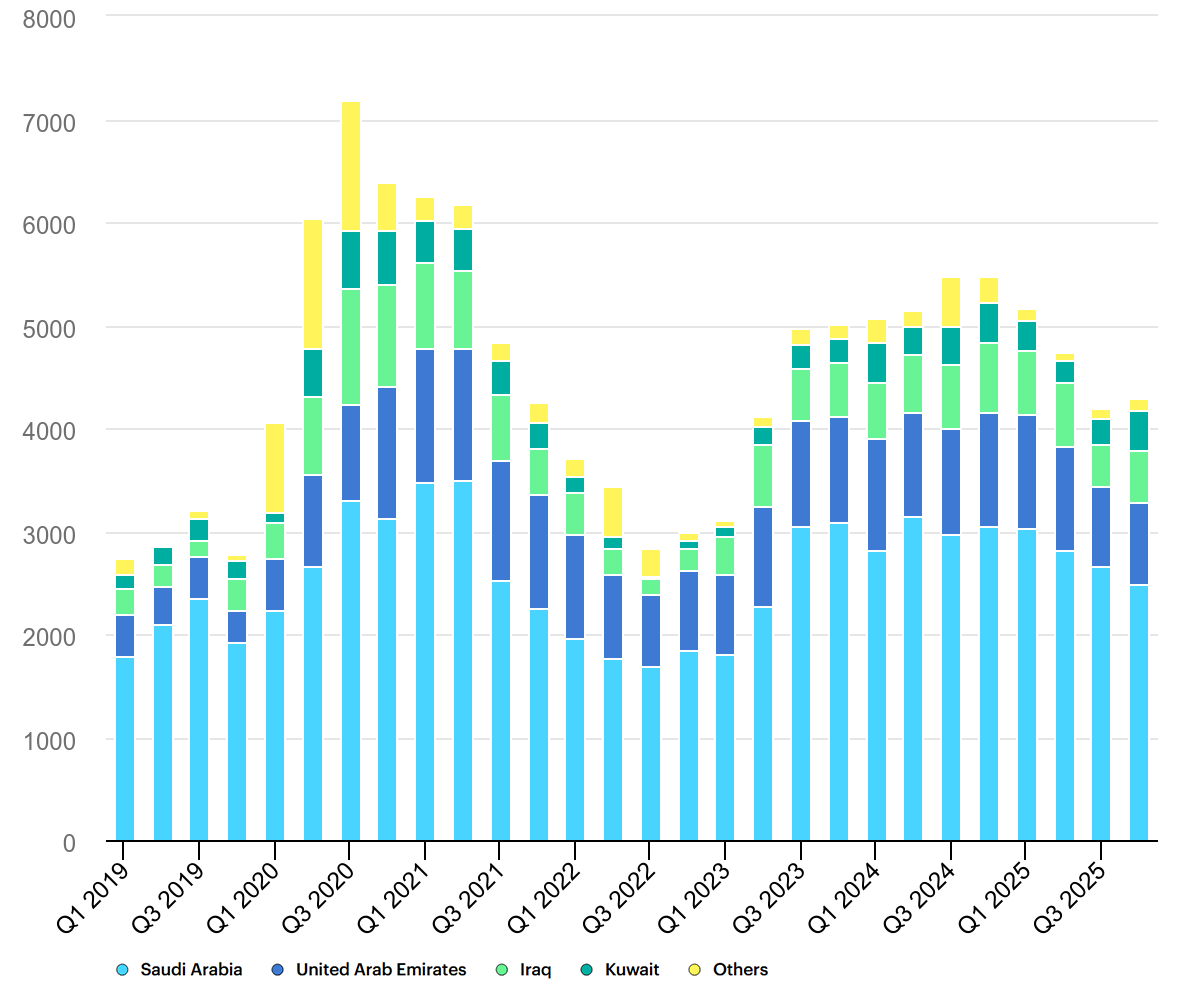 Figure 2: Just over 4m b/d of spare oil production capacity at the end of 2025 was held in countries that export via the Strait of Hormuz, including Saudi Arabia (lt. blue), the UAE (dk. blue), Iraq (lt. green), and Kuwait (dk. green). Others (yellow) include the rest of OPEC-13 but excludes Iranian and Venezuelan crude under sanctions. (Source: IEA 2026)